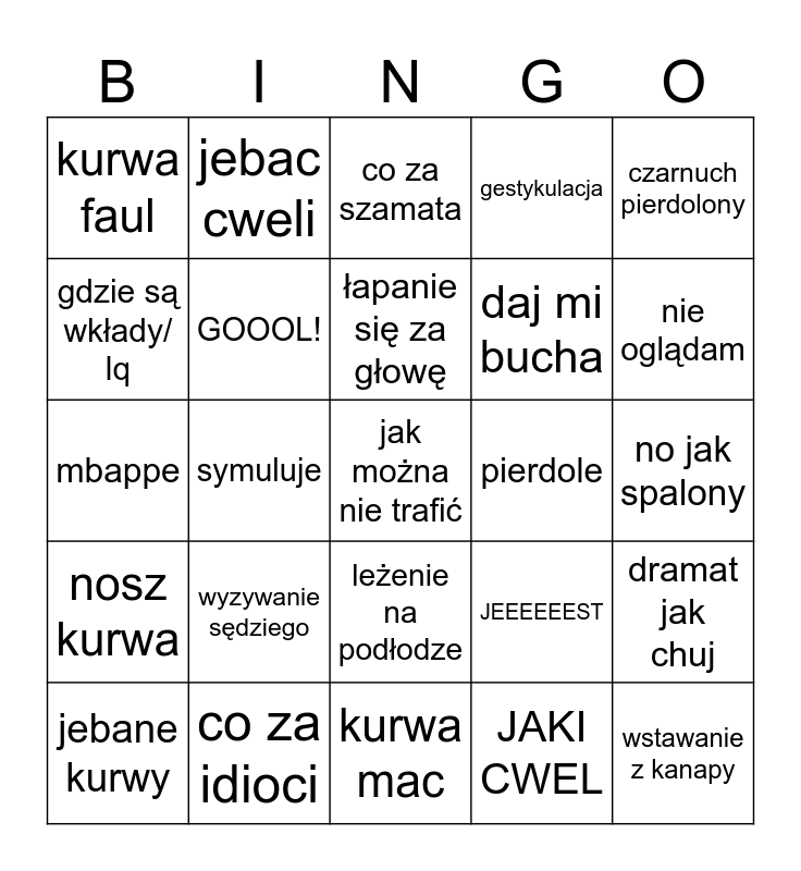 This bingo card has a free space and 34 words: KURWAAAAAA!, JAKI CWEL, co za zjeby, no ja pierdole, nosz kurwa, GOOOL!, czarnuch pierdolony, jebane kurwy, jebac cweli, pojebalo ich, łapanie się za głowę, co za szamata, nie no nie pierdol, jebana barcelona, pierdole, nie oglądam, co za idioci, mbappe, wyzywanie sędziego, JEEEEEEST, leżenie na podłodze, no jak kurwa kartka, kurwa faul, no jak spalony, kurwa mac, wstawanie z kanapy, gestykulacja, darcie pizdy, daj mi bucha, gdzie są wkłady/ lq, jak można nie strzelić, symuluje, dramat jak chuj and karne.