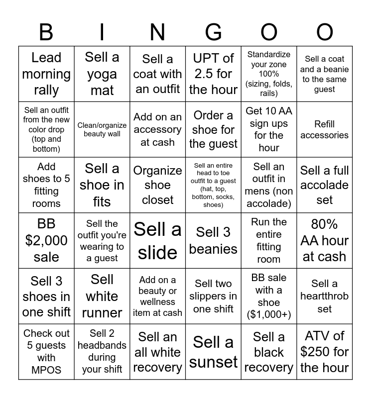 This bingo card has 36 words: Sell two slippers in one shift, Add on a beauty or wellness item at cash, Sell a sunset, Sell an outfit from the new color drop (top and bottom), BB $2,000 sale, Sell an entire head to toe outfit to a guest (hat, top, bottom, socks, shoes), Clean/organize beauty wall, Sell an all white recovery, Standardize your zone 100% (sizing, folds, rails), BB sale with a shoe ($1,000+), Refill accessories, UPT of 2.5 for the hour, Sell a heartthrob set, Sell a shoe in fits, Order a shoe for the guest, Lead morning rally, Sell 3 shoes in one shift, Sell an outfit in mens (non accolade), Add shoes to 5 fitting rooms, Sell a coat with an outfit, Organize shoe closet, Sell the outfit you're wearing to a guest, Sell 3 beanies, Sell a slide, Run the entire fitting room, Sell a yoga mat, Get 10 AA sign ups for the hour, Sell 2 headbands during your shift, Add on an accessory at cash, Sell a coat and a beanie to the same guest, ATV of $250 for the hour, Check out 5 guests with MPOS, 80% AA hour at cash, Sell a full accolade set, Sell white runner and Sell a black recovery.