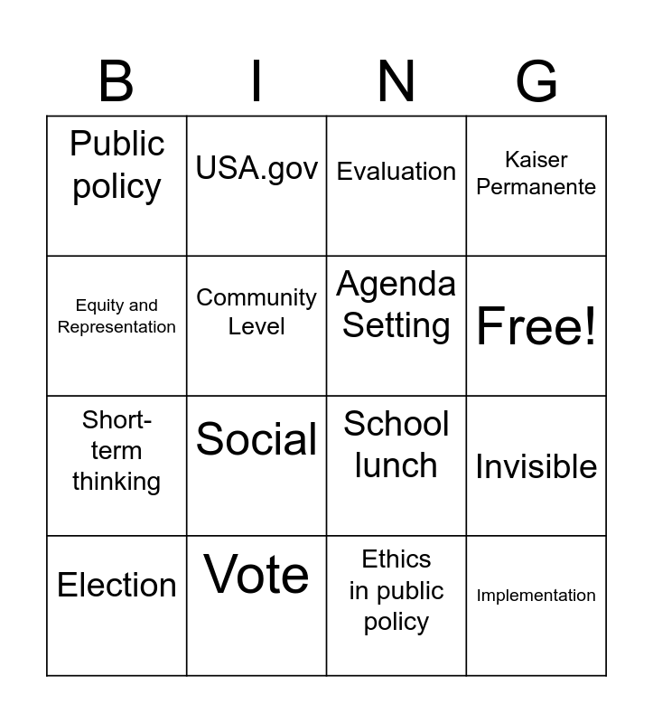 This bingo card has 18 words: Social, Implementation, Evaluation, Public policy, School lunch, Kaiser Permanente, Election, USA.gov, Free!, Short-term thinking, Ethics in public policy, Equity and Representation, Invisible, Community Level, Agenda Setting, Coalitions, Vote and Conceptual / Instrumental.