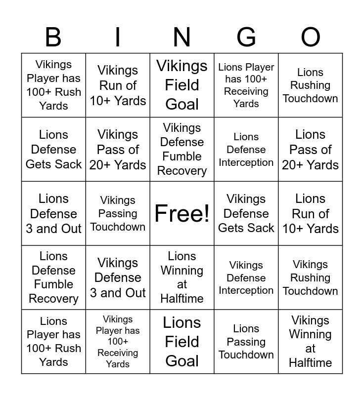 This bingo card has a free space and 24 words: Vikings Defense 3 and Out, Vikings Player has 100+ Receiving Yards, Vikings Defense Fumble Recovery, Lions Player has 100+ Rush Yards, Lions Rushing Touchdown, Vikings Player has 100+ Rush Yards, Lions Defense Gets Sack, Vikings Run of 10+ Yards, Vikings Defense Gets Sack, Lions Winning at Halftime, Lions Defense Interception, Lions Defense 3 and Out, Vikings Defense Interception, Vikings Rushing Touchdown, Vikings Pass of 20+ Yards, Lions Passing Touchdown, Lions Run of 10+ Yards, Vikings Field Goal, Lions Pass of 20+ Yards, Vikings Passing Touchdown, Vikings Winning at Halftime, Lions Defense Fumble Recovery, Lions Player has 100+ Receiving Yards and Lions Field Goal.