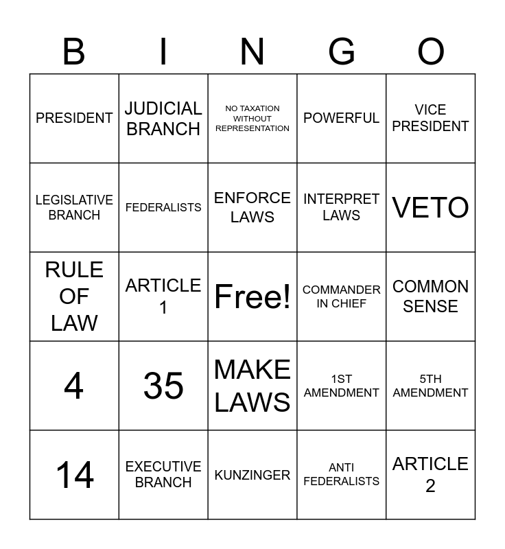 This bingo card has a free space and 24 words: 35, EXECUTIVE BRANCH, ENFORCE LAWS, 14, VICE PRESIDENT, PRESIDENT, LEGISLATIVE BRANCH, JUDICIAL BRANCH, COMMANDER IN CHIEF, MAKE LAWS, INTERPRET LAWS, RULE OF LAW, 1ST AMENDMENT, 5TH AMENDMENT, FEDERALISTS, ANTI FEDERALISTS, COMMON SENSE, NO TAXATION WITHOUT REPRESENTATION, VETO, ARTICLE 1, ARTICLE 2, 4, POWERFUL and KUNZINGER.