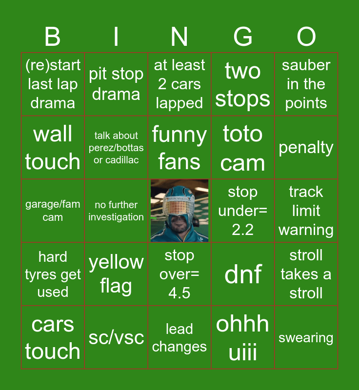 This bingo card has a free space and 24 words: yellow flag, sc/vsc, funny fans, cars touch, sauber in the points, (re)start last lap drama, wall touch, pit stop drama, stop under= 2.2, stop over= 4.5, toto cam, garage/fam cam, dnf, stroll takes a stroll, talk about perez/bottas or cadillac, ohhh uiii, track limit warning, at least 2 cars lapped, penalty, no further investigation, swearing, hard tyres get used, two stops and lead changes.