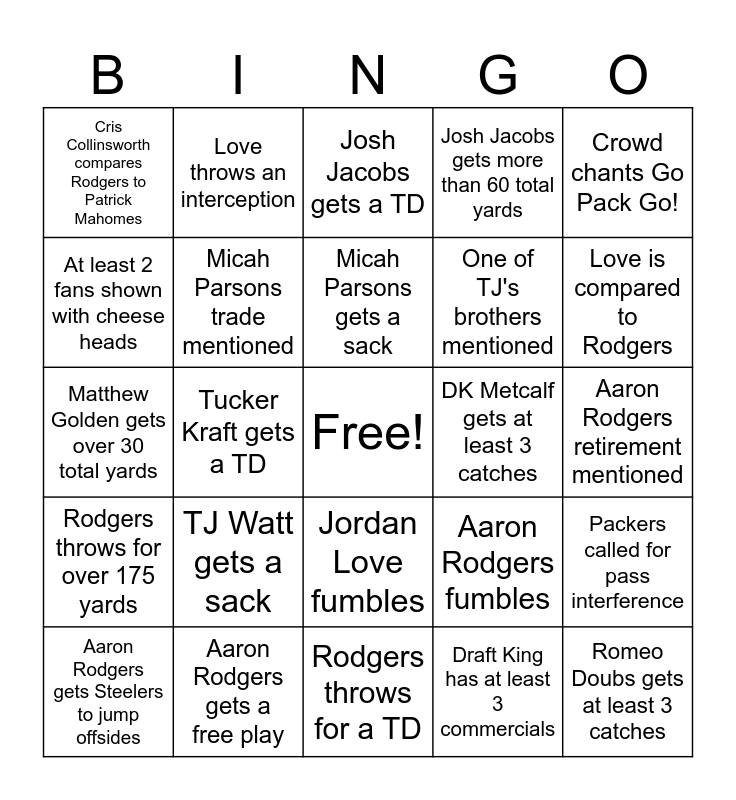 This bingo card has a free space and 24 words: TJ Watt gets a sack, Aaron Rodgers gets a free play, Micah Parsons gets a sack, Aaron Rodgers gets Steelers to jump offsides, Crowd chants Go Pack Go!, Cris Collinsworth compares Rodgers to Patrick Mahomes, At least 2 fans shown with cheese heads, Love throws an interception, DK Metcalf gets at least 3 catches, Jordan Love fumbles, One of TJ's brothers mentioned, Matthew Golden gets over 30 total yards, Aaron Rodgers fumbles, Packers called for pass interference, Micah Parsons trade mentioned, Draft King has at least 3 commercials, Aaron Rodgers retirement mentioned, Josh Jacobs gets a TD, Love is compared to Rodgers, Tucker Kraft gets a TD, Romeo Doubs gets at least 3 catches, Rodgers throws for over 175 yards, Josh Jacobs gets more than 60 total yards and Rodgers throws for a TD.