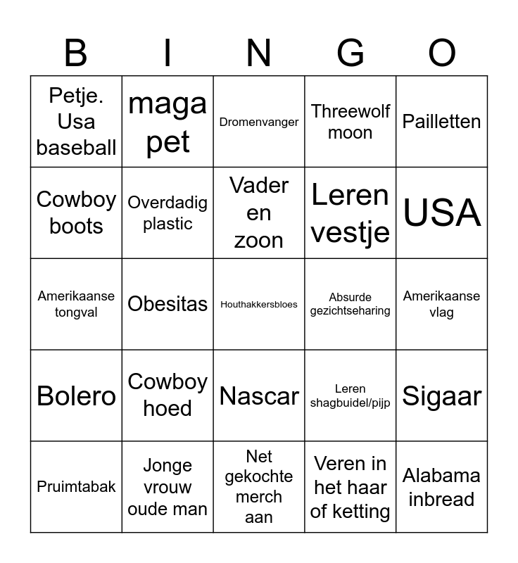 This bingo card has a free space and 24 words: Cowboy hoed, Jonge vrouw oude man, Vader en zoon, Pruimtabak, Pailletten, Petje. Usa baseball, Cowboy boots, maga pet, Absurde gezichtseharing, Nascar, Leren vestje, Amerikaanse tongval, Leren shagbuidel/pijp, Sigaar, Overdadig plastic, Veren in het haar of ketting, Amerikaanse vlag, Dromenvanger, USA, Obesitas, Alabama inbread, Bolero, Threewolf moon and Net gekochte merch aan.