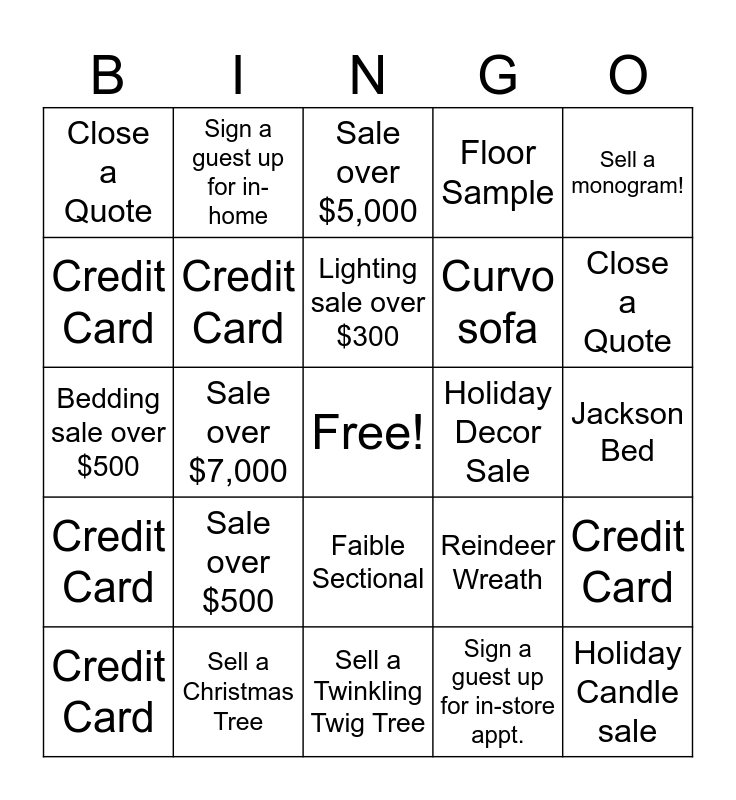 This bingo card has a free space and 24 words: Sale over $500, Sell a Christmas Tree, Lighting sale over $300, Credit Card, Sell a monogram!, Close a Quote, Credit Card, Sign a guest up for in-home, Holiday Decor Sale, Faible Sectional, Curvo sofa, Bedding sale over $500, Reindeer Wreath, Credit Card, Credit Card, Sign a guest up for in-store appt., Jackson Bed, Sale over $5,000, Close a Quote, Sale over $7,000, Holiday Candle sale, Credit Card, Floor Sample and Sell a Twinkling Twig Tree.