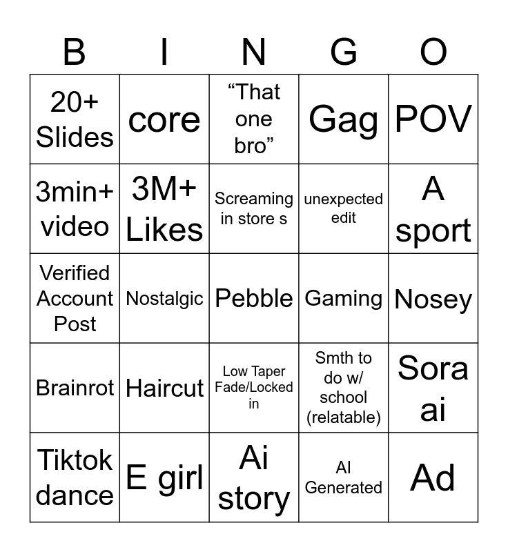 This bingo card has 25 words: Haircut, Ai story, Screaming in store s, Tiktok dance, POV, 20+ Slides, 3min+ video, core, Gaming, Low Taper Fade/Locked in, unexpected edit, Verified Account Post, Smth to do w/ school (relatable), Sora ai, 3M+ Likes, Ad, Nosey, “That one bro”, A sport, Nostalgic, Pebble, E girl, Brainrot, Gag and AI Generated.