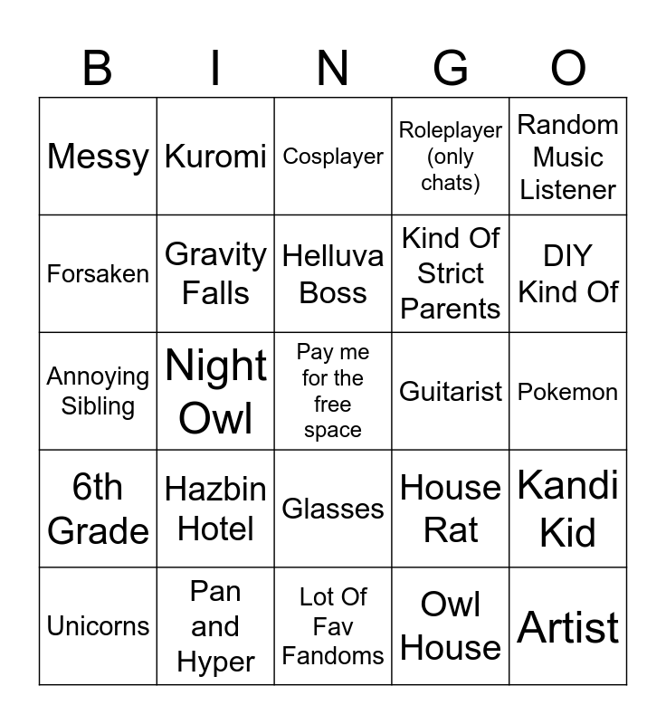 This bingo card has a free space and 24 words: Hazbin Hotel, Pan and Hyper, Helluva Boss, Unicorns, Random Music Listener, Messy, Forsaken, Kuromi, Guitarist, Glasses, Kind Of Strict Parents, Annoying Sibling, House Rat, Kandi Kid, Gravity Falls, Owl House, Pokemon, Cosplayer, DIY Kind Of, Night Owl, Artist, 6th Grade, Roleplayer (only chats) and Lot Of Fav Fandoms.
