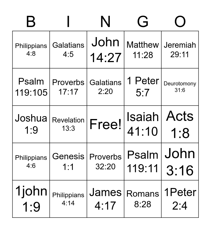 This bingo card has a free space and 24 words: Genesis 1:1, Philippians 4:14, Galatians 2:20, 1john 1:9, Jeremiah 29:11, Philippians 4:8, Psalm 119:105, Galatians 4:5, Isaiah 41:10, Proverbs 32:20, 1 Peter 5:7, Joshua 1:9, Psalm 119:11, John 3:16, Proverbs 17:17, Romans 8:28, Acts 1:8, John 14:27, Deurotomony 31:6, Revelation 13:3, 1Peter 2:4, Philippians 4:6, Matthew 11:28 and James 4:17.