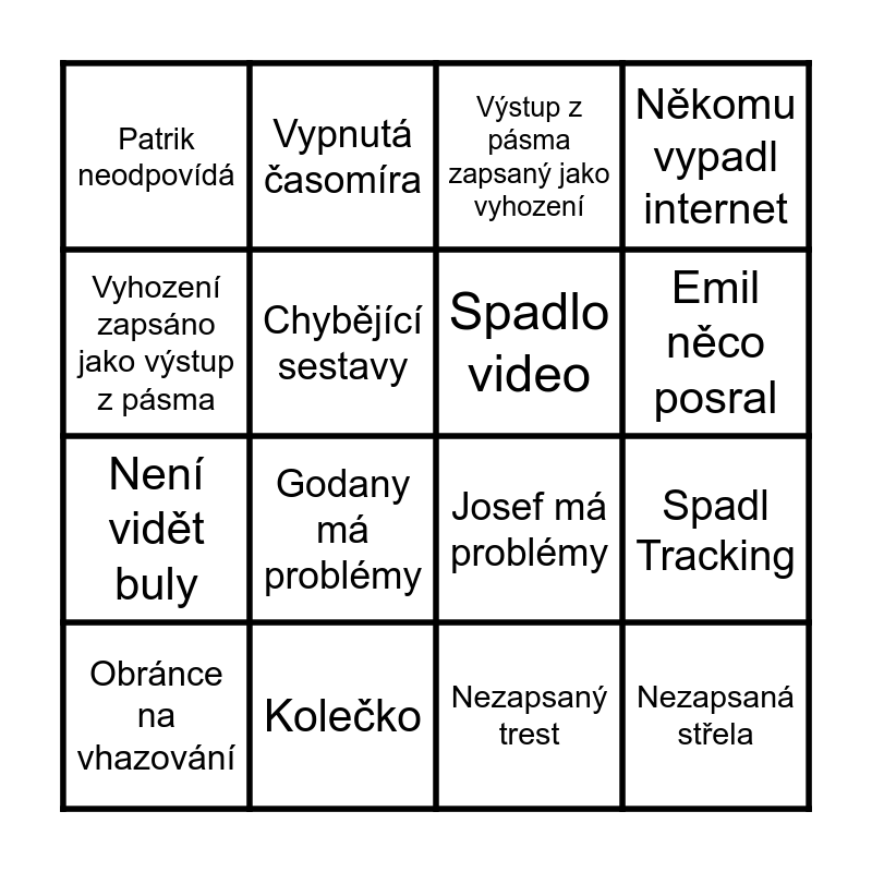 This bingo card has 16 words: Kolečko, Spadl Tracking, Výstup z pásma zapsaný jako vyhození, Patrik neodpovídá, Není vidět buly, Vypnutá časomíra, Josef má problémy, Nezapsaný trest, Vyhození zapsáno jako výstup z pásma, Chybějící sestavy, Obránce na vhazování, Někomu vypadl internet, Godany má problémy, Emil něco posral, Spadlo video and Nezapsaná střela.