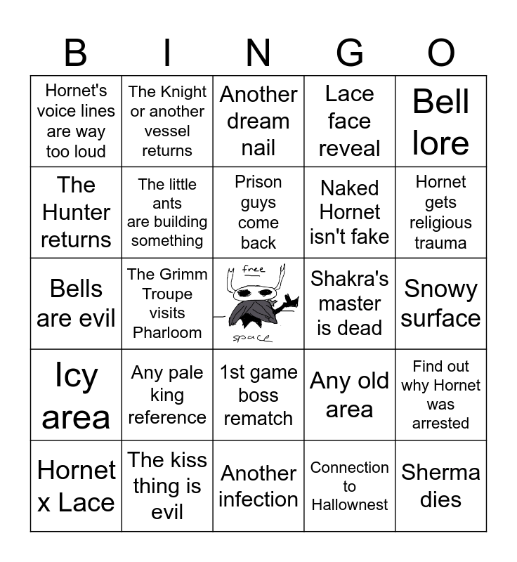 This bingo card has a free space and 24 words: Any pale king reference, The kiss thing is evil, Prison guys come back, Hornet x Lace, Bell lore, Hornet's voice lines are way too loud, The Hunter returns, The Knight or another vessel returns, Shakra's master is dead, 1st game boss rematch, Naked Hornet isn't fake, Bells are evil, Any old area, Find out why Hornet was arrested, The little ants are building something, Connection to Hallownest, Snowy surface, Another dream nail, Hornet gets religious trauma, The Grimm Troupe visits Pharloom, Sherma dies, Icy area, Lace face reveal and Another infection.