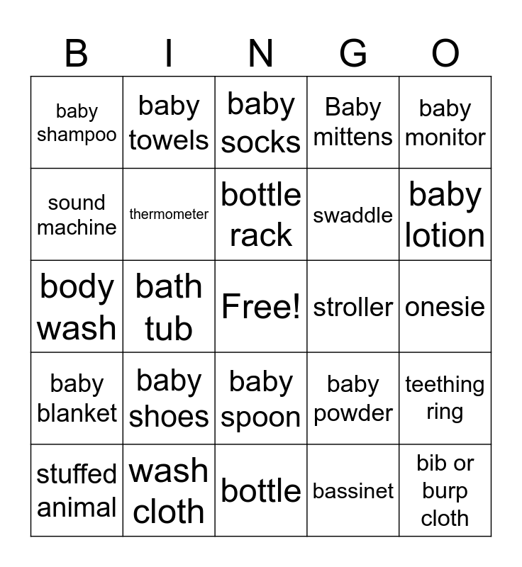 This bingo card has a free space and 29 words: stuffed animal, toy or rattle, bath tub, car seat, baby shampoo, baby socks, thermometer, baby shoes, stroller, wash cloth, onesie, bib or burp cloth, bottle, bassinet, baby lotion, pacifier, baby spoon, baby blanket, baby monitor, body wash, baby powder, diaper cream, swaddle, sound machine, Baby mittens, baby towels, teething ring, bottle rack and brush or comb.