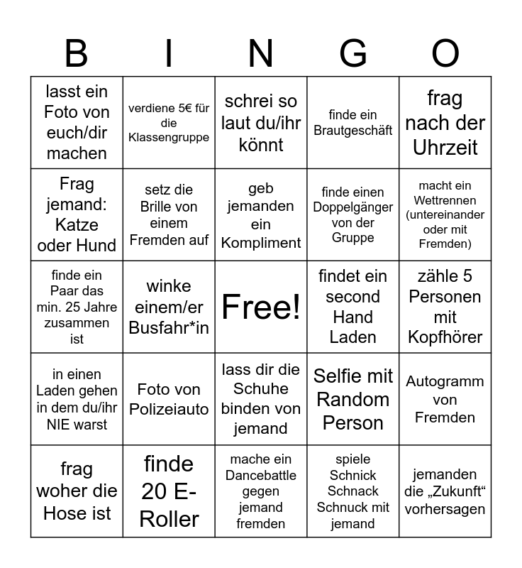 This bingo card has a free space and 24 words: Foto von Polizeiauto, finde 20 E-Roller, geb jemanden ein Kompliment, frag woher die Hose ist, frag nach der Uhrzeit, lasst ein Foto von euch/dir machen, Frag jemand: Katze oder Hund, verdiene 5€ für die Klassengruppe, findet ein second Hand Laden, lass dir die Schuhe binden von jemand, finde einen Doppelgänger von der Gruppe, finde ein Paar das min. 25 Jahre zusammen ist, Selfie mit Random Person, Autogramm von Fremden, setz die Brille von einem Fremden auf, spiele Schnick Schnack Schnuck mit jemand, zähle 5 Personen mit Kopfhörer, schrei so laut du/ihr könnt, macht ein Wettrennen (untereinander oder mit Fremden), winke einem/er Busfahr*in, jemanden die „Zukunft“ vorhersagen, in einen Laden gehen in dem du/ihr NIE warst, finde ein Brautgeschäft and mache ein Dancebattle gegen jemand fremden.