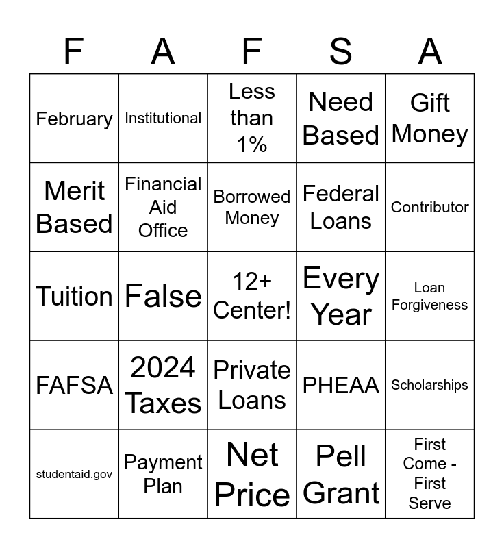 This bingo card has a free space and 29 words: studentaid.gov, True, False, October, February, Less than 1%, Financial Aid Office, 2024 Taxes, Every Year, Payment Plan, Loan Forgiveness, First Come - First Serve, Net Price, Pell Grant, Contributor, Work Study, Private Loans, FAFSA, Gift Money, Tuition, PHEAA, Earned Money, Federal Loans, Merit Based, Need Based, Institutional, Scholarships, Borrowed Money and GROW PA.