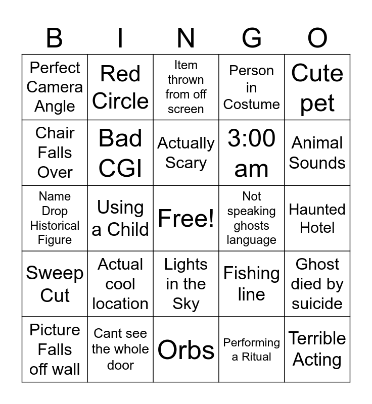 This bingo card has a free space and 36 words: Air currents, Squatter, Just their friend, Bad CGI, Fishing line, Sweep Cut, Actually Scary, Using their child, Cute pet, Inanimate Object that looks humanoid, Using a Child, Person in Costume, Hi-Tech equipment, Not speaking ghosts language, Animal Sounds, Perfect Camera Angle, Nightvision Camera, Actual cool location, Terrible Acting, Item thrown from off screen, Haunted Hotel, Ghost died by suicide, Cant see the whole door, Picture Falls off wall, Orbs, Red Circle, Name Drop Historical Figure, Unintelligible Spirit Box, 3:00 am, Chair Falls Over, Lights Go Out, Dash Cam Footage, Performing a Ritual, Lights in the Sky, Sped Up Footage and Reversed Footage.