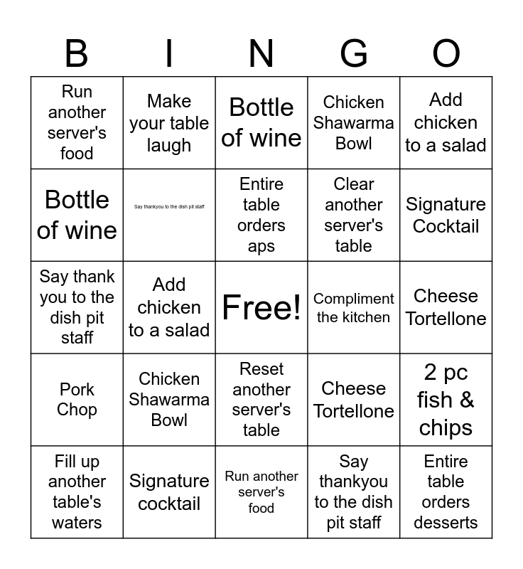 This bingo card has a free space and 24 words: Chicken Shawarma Bowl, Signature cocktail, Entire table orders aps, Fill up another table's waters, Add chicken to a salad, Run another server's food, Bottle of wine, Make your table laugh, Compliment the kitchen, Reset another server's table, Clear another server's table, Say thank you to the dish pit staff, Cheese Tortellone, 2 pc fish & chips, Say thankyou to the dish pit staff, Say thankyou to the dish pit staff, Cheese Tortellone, Bottle of wine, Signature Cocktail, Add chicken to a salad, Entire table orders desserts, Pork Chop, Chicken Shawarma Bowl and Run another server's food.