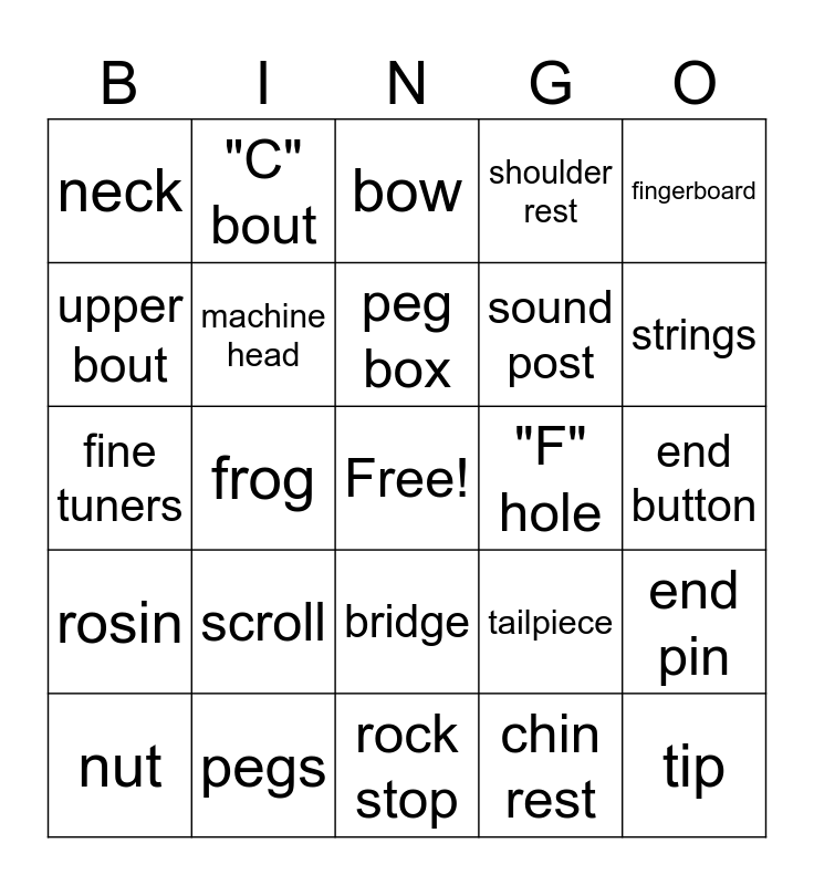 This bingo card has a free space and 24 words: scroll, pegs, peg box, nut, fingerboard, neck, upper bout, "C" bout, "F" hole, bridge, sound post, fine tuners, tailpiece, end pin, machine head, chin rest, end button, bow, strings, frog, tip, rosin, shoulder rest and rock stop.
