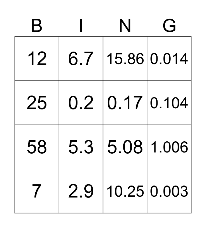 This bingo card has 40 words: 3, 0.2, 0.04, 0.003, 7, 1.5, 0.17, 0.027, 12, 2.9, 1.23, 0.104, 25, 5.3, 2.05, 0.258, 40, 6.7, 3.45, 0.014, 58, 9.8, 5.08, 1.006, 75, 10.1, 7.62, 2.019, 93, 12.4, 8.99, 3.270, 104, 20.9, 10.25, 6.973, 250, 45.6, 15.86 and 21.074.