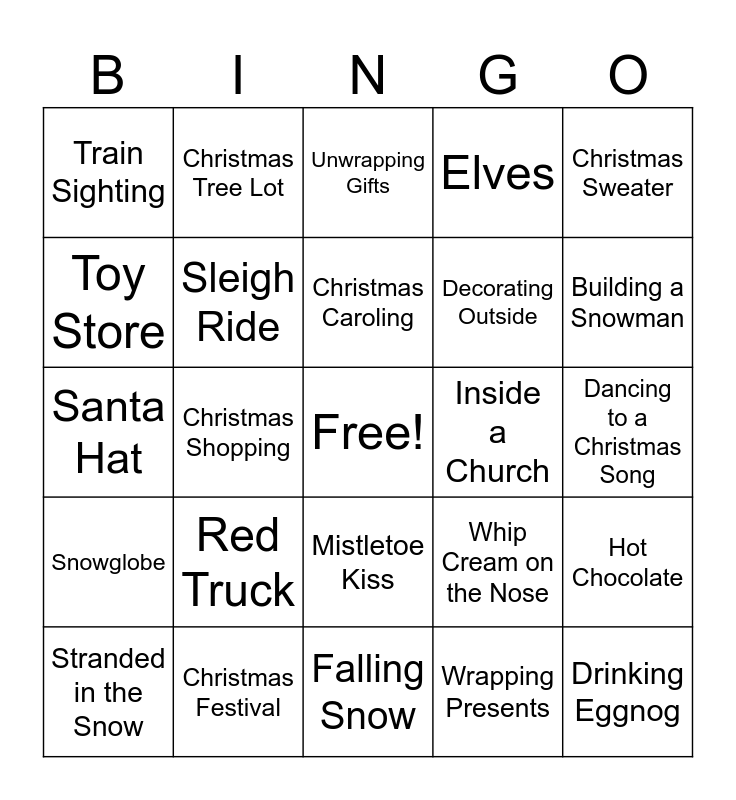 This bingo card has a free space and 50 words: Decorating a Wreath, Drinking Eggnog, Snowball Fight, Falling Snow, Red Truck, Cutting Down a Christmas Tree, Christmas Tree Lot, Santa Sighting, Toy Store, Nativity, Sleigh Ride, Elves, Hot Chocolate, Whip Cream on the Nose, Baking/Decorating Christmas Cookies, Eating Christmas Cookies, Christmas Caroling, Inside a Church, Ice Skating or Skiing, Christmas Sweater, Christmas Shopping, Wrapping Presents, Train Sighting, Decorating Outside, Poinsettia Plant, Candy Cane, Building a Snowman, Christmas Angel in the Snow, Unwrapping Gifts, Mistletoe Kiss, Making a Christmas Craft, Angel Sighting, Making/Hanging a Christmas Wreath, Singing Christmas Songs, Christmas Festival, Hanging the Stockings, Sitting by a Fire, Bells Ringing, Christmas Play/Concert, Dancing to a Christmas Song, Christmas Parade, Sledding, Flannel Plaid Shirt, Town Tree Lighting, Stranded in the Snow, Santa Hat, Christmas PJ’s, Characters with Christmas Names, Snowglobe and A Christmas Shop.