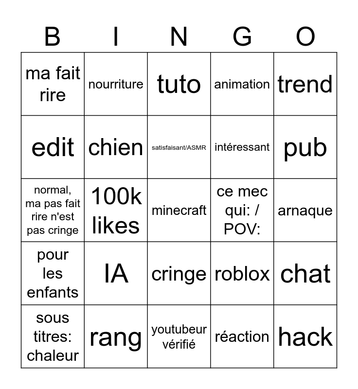 This bingo card has a free space and 24 words: IA, rang, satisfaisant/ASMR, sous titres: chaleur, trend, ma fait rire, edit, nourriture, ce mec qui: / POV:, cringe, intéressant, normal, ma pas fait rire n'est pas cringe, roblox, chat, chien, réaction, arnaque, tuto, pub, 100k likes, hack, pour les enfants, animation and youtubeur vérifié.