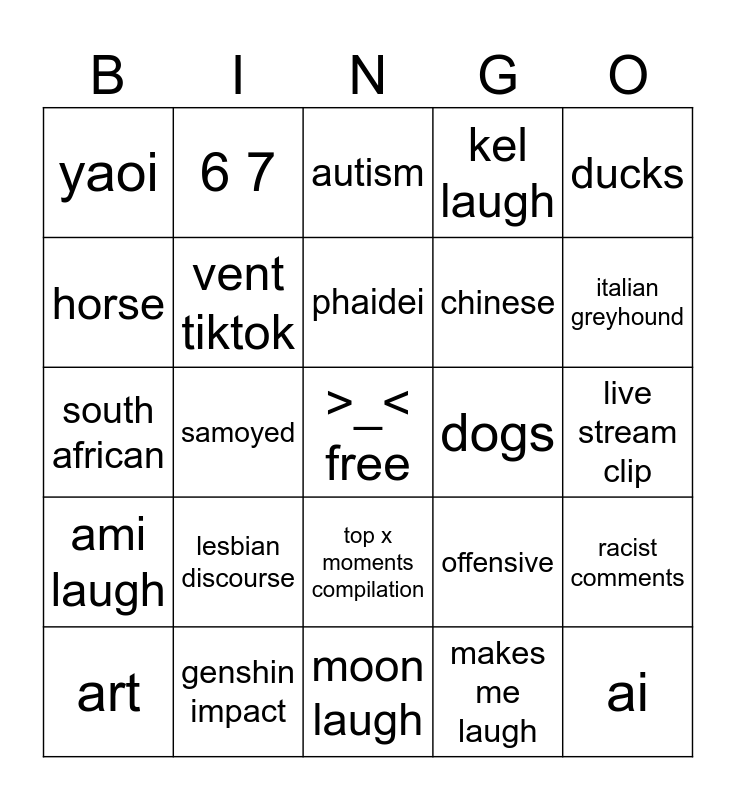 This bingo card has a free space and 24 words: lesbian discourse, genshin impact, phaidei, art, ducks, yaoi, horse, 6 7, dogs, top x moments compilation, chinese, south african, offensive, racist comments, vent tiktok, makes me laugh, live stream clip, autism, italian greyhound, samoyed, ai, ami laugh, kel laugh and moon laugh.