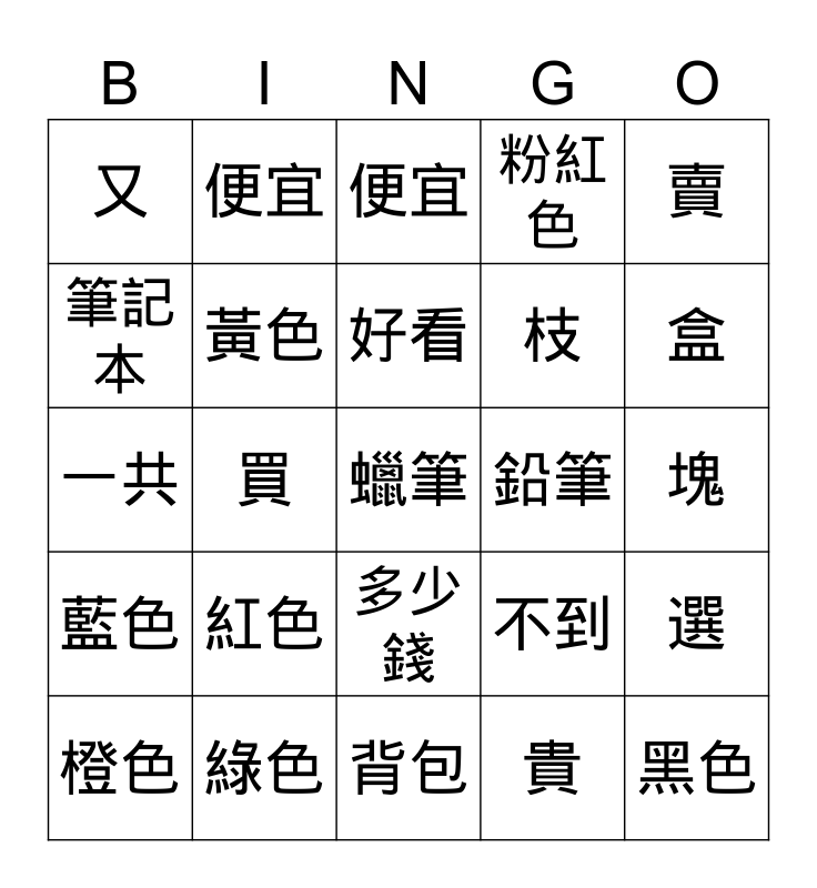 This bingo card has a free space and 24 words: 紅色, 綠色, 好看, 橙色, 賣, 又, 筆記本, 便宜, 鉛筆, 多少錢, 枝, 一共, 不到, 選, 黃色, 貴, 塊, 便宜, 盒, 買, 黑色, 藍色, 粉紅色 and 背包.