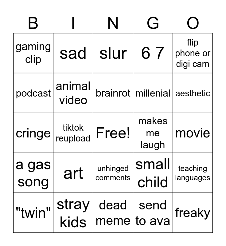 This bingo card has a free space and 24 words: art, stray kids, brainrot, "twin", flip phone or digi cam, gaming clip, podcast, sad, makes me laugh, unhinged comments, millenial, cringe, small child, teaching languages, animal video, send to ava, movie, slur, aesthetic, tiktok reupload, freaky, a gas song, 6 7 and dead meme.