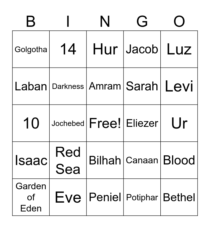 This bingo card has a free space and 54 words: Abraham, Isaac, Rachel, Zilpah, Bilhah, Rebekah, Jacob, Esau, Laban, Mount Moriah, Golgotha, Adam, Eve, Garden of Eden, Leah, Peniel, Bethel, Sarah, Tree of Knowledge & Wisdom, Ur, Canaan, ram, Eliezer, Luz, Joseph, 14, 7, 6, 20, Potiphar, Benjamin, Miriam, Aaron, Mt. Sinai, Hur, 120, 10, Blood, Frogs, Darkness, Locusts, Gold Bull, Manna, Quail, Red Sea, Pillar of fire, Pillar of cloud, Marah, Amram, Jochebed, Levi, Zipporah, Jethro and Pharaoh.