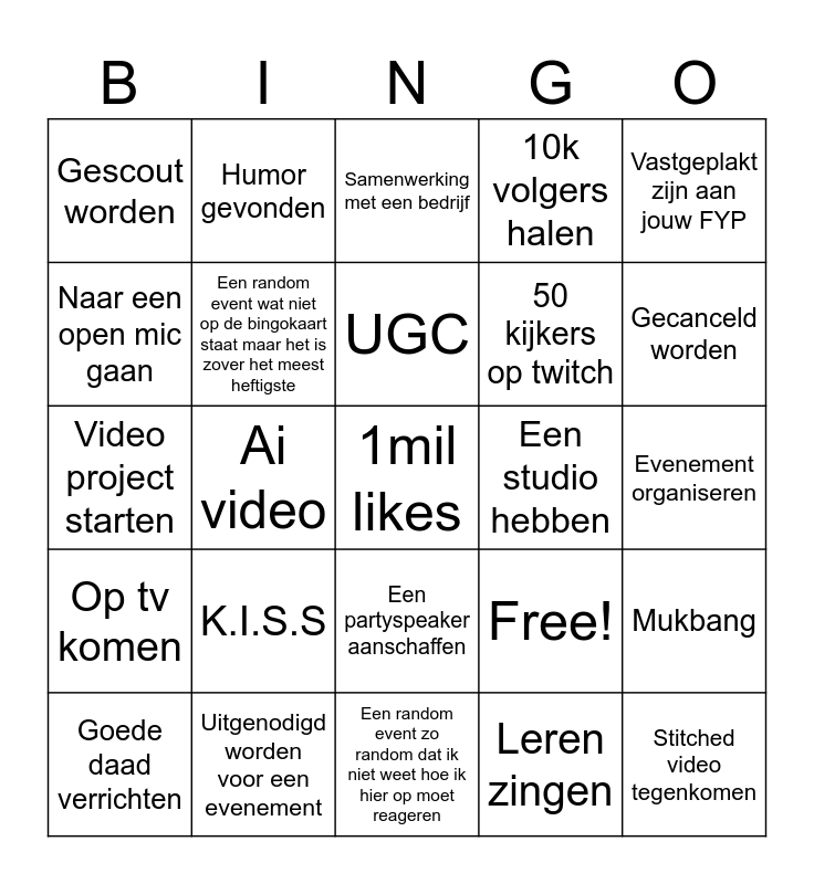 This bingo card has 25 words: K.I.S.S, Een random event zo random dat ik niet weet hoe ik hier op moet reageren, UGC, Goede daad verrichten, Vastgeplakt zijn aan jouw FYP, Gescout worden, Naar een open mic gaan, Humor gevonden, Een studio hebben, Een partyspeaker aanschaffen, 50 kijkers op twitch, Video project starten, Free!, Mukbang, Een random event wat niet op de bingokaart staat maar het is zover het meest heftigste, Stitched video tegenkomen, Evenement organiseren, Samenwerking met een bedrijf, Gecanceld worden, Ai video, 1mil likes, Uitgenodigd worden voor een evenement, Op tv komen, 10k volgers halen and Leren zingen.