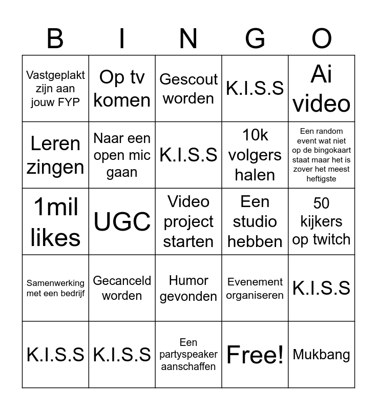This bingo card has 30 words: K.I.S.S, Een random event zo random dat ik niet weet hoe ik hier op moet reageren, UGC, Goede daad verrichten, Vastgeplakt zijn aan jouw FYP, Gescout worden, Naar een open mic gaan, Humor gevonden, Een studio hebben, Een partyspeaker aanschaffen, 50 kijkers op twitch, Video project starten, Free!, Mukbang, Een random event wat niet op de bingokaart staat maar het is zover het meest heftigste, Stitched video tegenkomen, Evenement organiseren, Samenwerking met een bedrijf, Gecanceld worden, Ai video, 1mil likes, Uitgenodigd worden voor een evenement, Op tv komen, 10k volgers halen, Leren zingen, K.I.S.S, K.I.S.S, K.I.S.S, K.I.S.S and K.I.S.S.