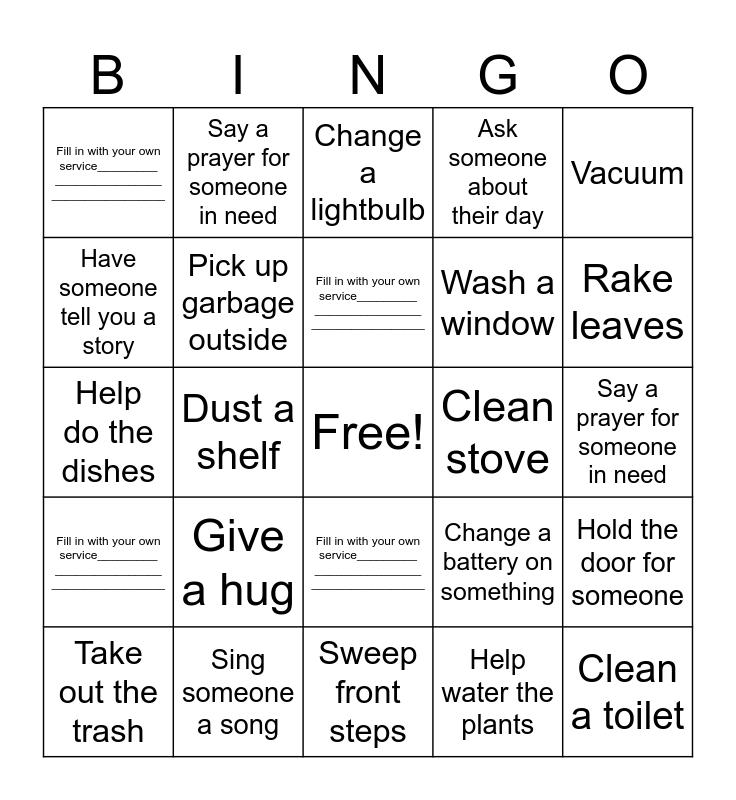 This bingo card has a free space and 24 words: Give a hug, Sing someone a song, Fill in with your own service_________ ________________ _________________, Take out the trash, Vacuum, Fill in with your own service_________ ________________ _________________, Have someone tell you a story, Say a prayer for someone in need, Clean stove, Fill in with your own service_________ ________________ _________________, Wash a window, Help do the dishes, Change a battery on something, Hold the door for someone, Pick up garbage outside, Help water the plants, Say a prayer for someone in need, Change a lightbulb, Rake leaves, Dust a shelf, Clean a toilet, Fill in with your own service_________ ________________ _________________, Ask someone about their day and Sweep front steps.