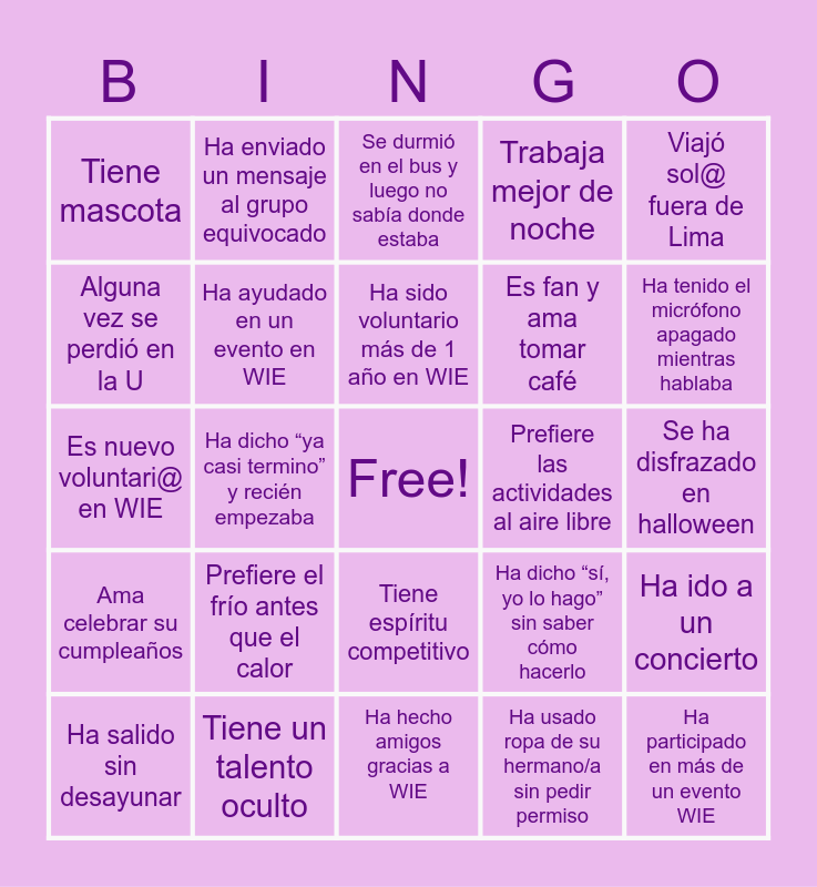 This bingo card has a free space and 24 words: Prefiere el frío antes que el calor, Tiene un talento oculto, Ha sido voluntario más de 1 año en WIE, Ha salido sin desayunar, Viajó sol@ fuera de Lima, Tiene mascota, Alguna vez se perdió en la U, Ha enviado un mensaje al grupo equivocado, Prefiere las actividades al aire libre, Tiene espíritu competitivo, Es fan y ama tomar café, Es nuevo voluntari@ en WIE, Ha dicho “sí, yo lo hago” sin saber cómo hacerlo, Ha ido a un concierto, Ha ayudado en un evento en WIE, Ha usado ropa de su hermano/a sin pedir permiso, Se ha disfrazado en halloween, Se durmió en el bus y luego no sabía donde estaba, Ha tenido el micrófono apagado mientras hablaba, Ha dicho “ya casi termino” y recién empezaba, Ha participado en más de un evento WIE, Ama celebrar su cumpleaños, Trabaja mejor de noche and Ha hecho amigos gracias a WIE.