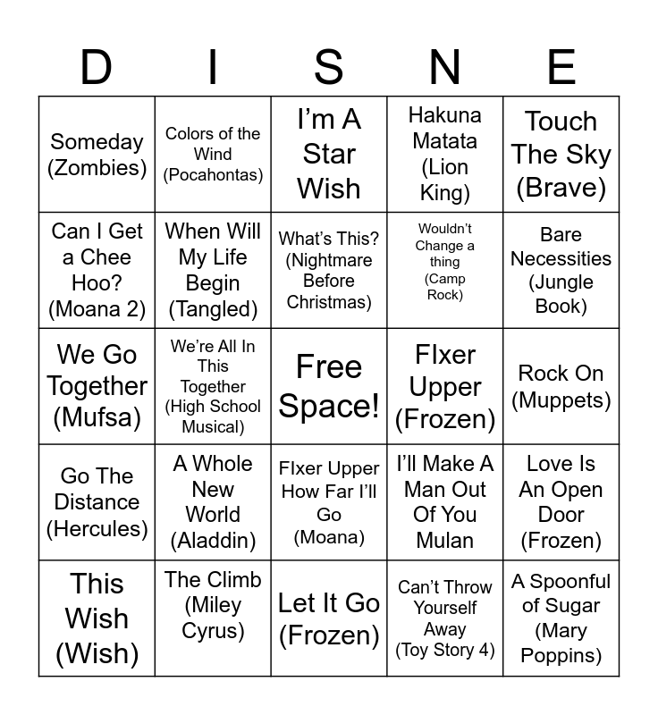 This bingo card has a free space and 24 words: A Whole New World (Aladdin), The Climb (Miley Cyrus), What’s This? (Nightmare Before Christmas), This Wish (Wish), Touch The Sky (Brave), Someday (Zombies), Can I Get a Chee Hoo? (Moana 2), Colors of the Wind (Pocahontas), FIxer Upper (Frozen), FIxer Upper How Far I’ll Go (Moana), Wouldn’t Change a thing (Camp Rock), We Go Together (Mufsa), I’ll Make A Man Out Of You Mulan, Love Is An Open Door (Frozen), When Will My Life Begin (Tangled), Can’t Throw Yourself Away (Toy Story 4), Rock On (Muppets), I’m A Star Wish, Bare Necessities (Jungle Book), We’re All In This Together (High School Musical), A Spoonful of Sugar (Mary Poppins), Go The Distance (Hercules), Hakuna Matata (Lion King) and Let It Go (Frozen).