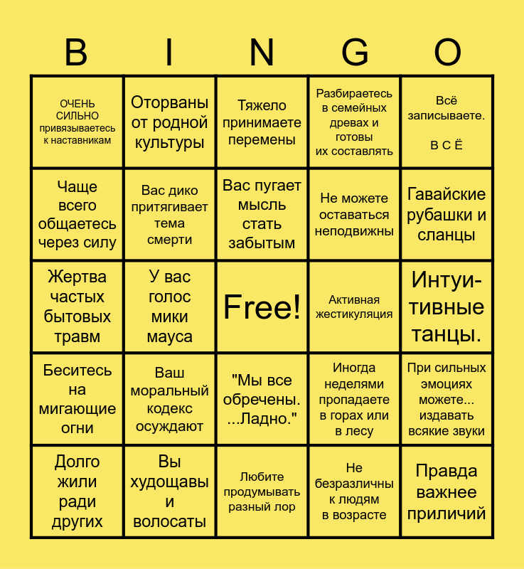 This bingo card has a free space and 24 words: Ваш моральный кодекс осуждают, Вы худощавы и волосаты, Вас пугает мысль стать забытым, Долго жили ради других, Всё записываете. В С Ё, ОЧЕНЬ СИЛЬНО привязываетесь к наставникам, Чаще всего общаетесь через силу, Оторваны от родной культуры, Активная жестикуляция, "Мы все обречены. ...Ладно.", Не можете оставаться неподвижны, Жертва частых бытовых травм, Иногда неделями пропадаете в горах или в лесу, При сильных эмоциях можете... издавать всякие звуки, Вас дико притягивает тема смерти, Не безразличны к людям в возрасте, Интуи-тивные танцы., Тяжело принимаете перемены, Гавайские рубашки и сланцы, У вас голос мики мауса, Правда важнее приличий, Беситесь на мигающие огни, Разбираетесь в семейных древах и готовы их составлять and Любите продумывать разный лор.