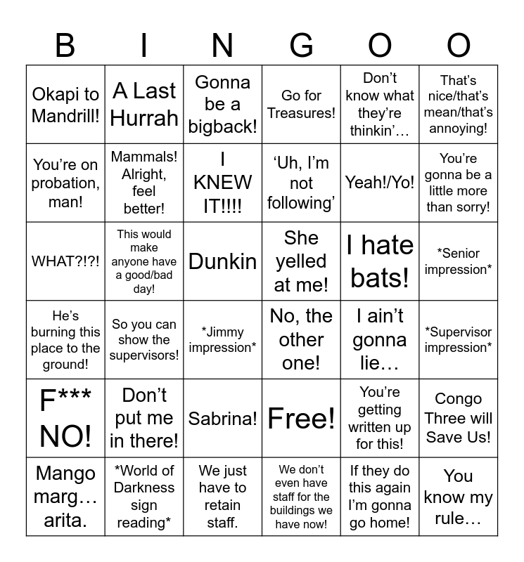 This bingo card has 36 words: Free!, Sabrina!, We don’t even have staff for the buildings we have now!, You’re on probation, man!, He’s burning this place to the ground!, She yelled at me!, Mammals! Alright, feel better!, We just have to retain staff., Don’t know what they’re thinkin’…, You’re getting written up for this!, You’re gonna be a little more than sorry!, Go for Treasures!, Congo Three will Save Us!, This would make anyone have a good/bad day!, ‘Uh, I’m not following’, Okapi to Mandrill!, F*** NO!, I hate bats!, WHAT?!?!, Gonna be a bigback!, Dunkin, So you can show the supervisors!, No, the other one!, *Jimmy impression*, I ain’t gonna lie…, A Last Hurrah, Yeah!/Yo!, *World of Darkness sign reading*, I KNEW IT!!!!, That’s nice/that’s mean/that’s annoying!, You know my rule…, Mango marg…arita., *Supervisor impression*, *Senior impression*, Don’t put me in there! and If they do this again I’m gonna go home!.