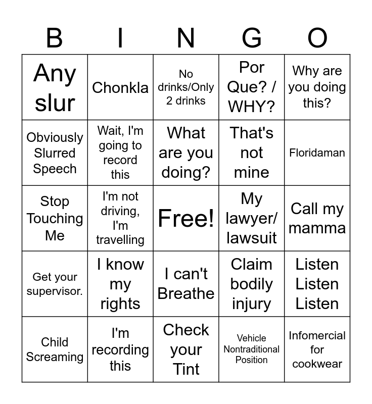 This bingo card has a free space and 40 words: You don't know who I am, Stop Touching Me, What is your RAS, Wait, I'm going to record this, I'm recording this, I can't Breathe, What are you doing?, I'm not resisting., Why are you doing this?, Get your supervisor., I'm not driving, I'm travelling, Por Que? / WHY?, Infomercial for cookwear, Call my mamma, My lawyer/ lawsuit, I know my rights, I ain't not did nuffin/dindu nuffin, Any slur, No Physical License, No drinks/Only 2 drinks, Listen Listen Listen, Vehicle Nontraditional Position, That's not mine, Obviously Slurred Speech, Medical Condition, Hide Behind Child, "Get out of the vehicle", "Get back in the vehicle", Open door uninstructed, (to LEO) Hurry up, Passenger needs to shut up, Child Screaming, Incarceritis, Claim bodily injury, Floridaman, Check your Tint, Human Trafficking, For no reason, Chonkla and My Phone / Where's my phone.