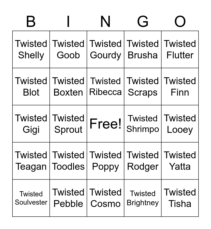 This bingo card has a free space and 30 words: Twisted Pebble, Twisted Astro, Twisted Sprout, Twisted Vee, Twisted Shelly, Twisted Gourdy, Twisted Boxten, Twisted Poppy, Twisted Shrimpo, Twisted Cosmo, Twisted Looey, Twisted Tisha, Twisted Brightney, Twisted Connie, Twisted Finn, Twisted RnD, Twisted Rodger, Twisted Teagan, Twisted Toodles, Twisted Flutter, Twisted Gigi, Twisted Glisten, Twisted Goob, Twisted Scraps, Twisted Blot, Twisted Brusha, Twisted Yatta, Twisted Soulvester, Twisted Ribecca and Twisted Eclipse.