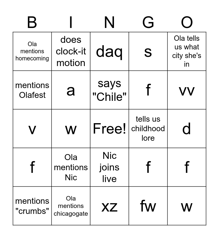 This bingo card has a free space and 24 words: Ola mentions Nic, Ola mentions chicagogate, says "Chile", mentions "crumbs", Ola tells us what city she's in, Ola mentions homecoming, mentions Olafest, does clock-it motion, tells us childhood lore, Nic joins live, f, v, f, f, a, fw, d, daq, vv, w, w, f, s and xz.