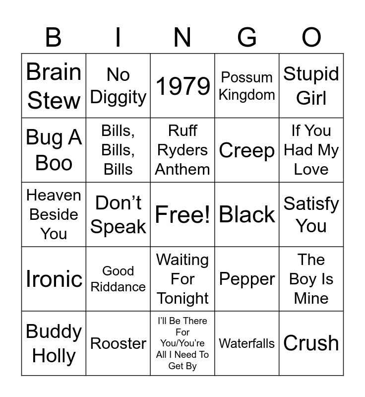 This bingo card has a free space and 84 words: (You Drive Me) Crazy, …Baby One More Time, 1979, All Apologies, All Cried Out, All I Wanna Do, Amazing, Any Man Of Mine, Baby Got Back, Back That Thang Up, Been Caught Stealing, Better Man, Bills, Bills, Bills, Black, Black Hole Sun, Brain Stew, Buddy Holly, Bug A Boo, Bulls On Parade, Burden In My Hand, Crazy, Creep, Crush, Q-pid, Don’t Speak, Dreamlover, Enter Sandman, Everybody (Backstreets Back), Genie In A Bottle, Gin And Juice, Good Riddance, Got you (Where I Want You), Heart-Shaped Box, Heaven Beside You, Hey Jealousy, I Want It That Way, I’ll Be There For You/You’re All I Need To Get By, If It Makes You Happy, If You Had My Love, Ironic, It’s All About The Benjamins, Just A Girl, Linger, Lump, Man In The Box, Man! I Feel Like A Woman!, No Diggity, No Rain, No Scrubs, Nothing Else Matters, Only Happy When It Rains, Pepper, Possum Kingdom, Pretty Fly, Push It, Renee, Rooster, Ruff Ryders Anthem, Sad But True, Satisfy You, Say My Name, Self Esteem, She Talks To Angels, Shoop, Smells Like Teen Spirit, Something In The Way, Spiderwebs, Spoonman, Stupid Girl, Tearin’ Up My Heart, The Boy Is Mine, This Is How We Do It, To Be With You, Tonight, Tonight, Waiting For Tonight, Waterfalls, What Is Love, What You Want, Whatta Man, When I Come Around, Where My Girls At, Would?, You Gotta Be and You Oughta Know.