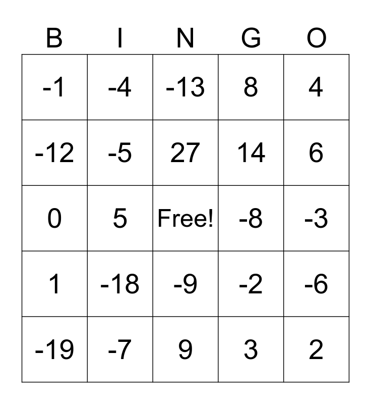 This bingo card has a free space and 24 words: -18, -7, 27, -19, 4, -1, -12, -4, -8, -9, 14, 0, -2, -6, -5, 3, -3, -13, 6, 5, 2, 1, 8 and 9.
