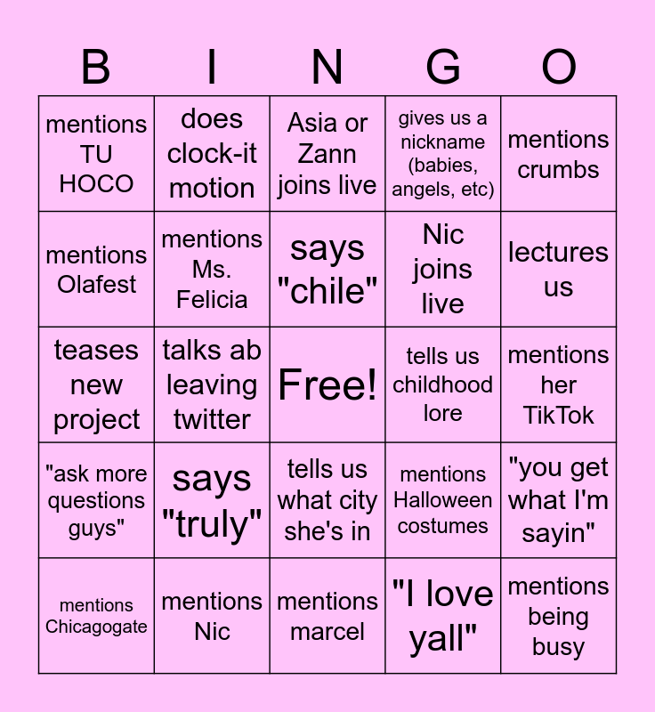 This bingo card has a free space and 24 words: says "truly", mentions Nic, says "chile", mentions Chicagogate, mentions crumbs, mentions TU HOCO, mentions Olafest, does clock-it motion, tells us childhood lore, tells us what city she's in, Nic joins live, teases new project, mentions Halloween costumes, "you get what I'm sayin", mentions Ms. Felicia, "I love yall", mentions her TikTok, Asia or Zann joins live, lectures us, talks ab leaving twitter, mentions being busy, "ask more questions guys", gives us a nickname (babies, angels, etc) and mentions marcel.