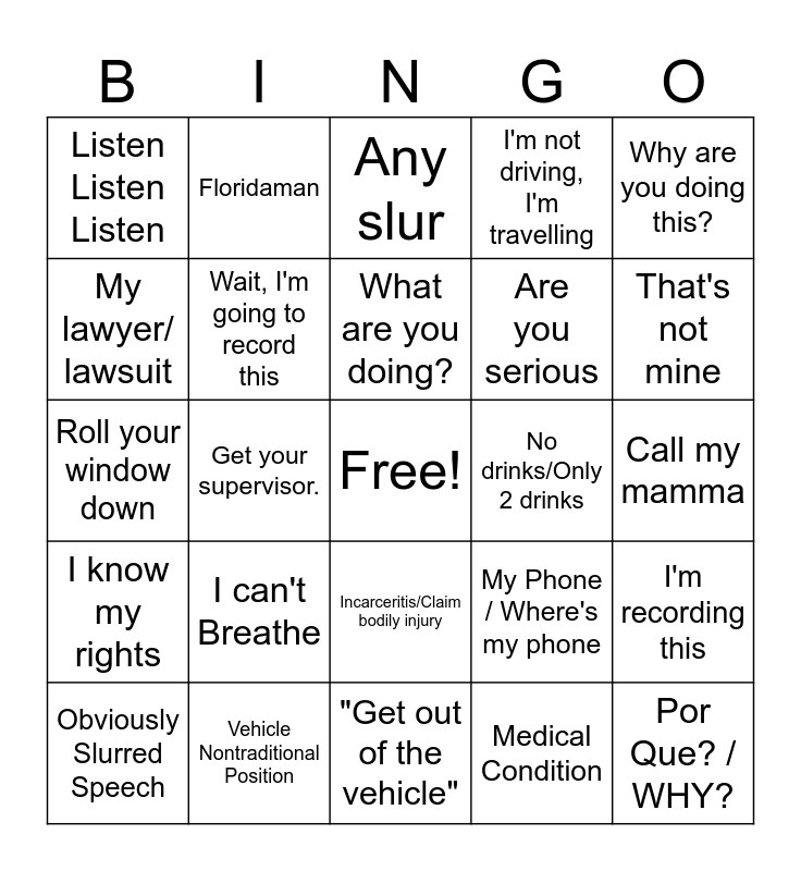 This bingo card has a free space and 38 words: You don't know who I am, Stop Touching Me, What is your RAS, Wait, I'm going to record this, I'm recording this, I can't Breathe, What are you doing?, I'm not resisting., Why are you doing this?, Are you serious, Get your supervisor., I'm not driving, I'm travelling, Por Que? / WHY?, Call my mamma, My lawyer/ lawsuit, I know my rights, I ain't not did nuffin/dindu nuffin/What did I do, Any slur, No Physical License, No drinks/Only 2 drinks, Listen Listen Listen, Vehicle Nontraditional Position, That's not mine, Obviously Slurred Speech, Hide Behind Child, "Get out of the vehicle", "Get back in the vehicle", Open door uninstructed, LEO Pull subject out of vehicle, Passenger needs to shut up, Child Screaming, Incarceritis/Claim bodily injury, Medical Condition, Floridaman, For no reason, My Phone / Where's my phone, Roll your window down and GET TAZED/Pew-ed.