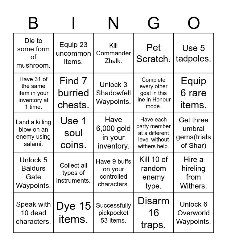 This bingo card has 25 words: Collect all types of instruments., Successfully pickpocket 53 items., Unlock 3 Shadowfell Waypoints., Speak with 10 dead characters., Use 5 tadpoles., Die to some form of mushroom., Have 31 of the same item in your inventory at 1 time., Equip 23 uncommon items., Have each party member at a different level without withers help., Have 9 buffs on your controlled characters., Complete every other goal in this line in Honour mode., Land a killing blow on an enemy using salami., Kill 10 of random enemy type., Hire a hireling from Withers., Find 7 burried chests., Unlock 6 Overworld Waypoints., Get three umbral gems(trials of Shar), Kill Commander Zhalk., Equip 6 rare items., Use 1 soul coins., Have 6,000 gold in your inventory., Dye 15 items., Unlock 5 Baldurs Gate Waypoints., Pet Scratch. and Disarm 16 traps..