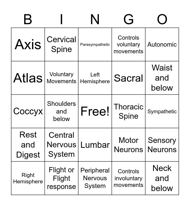 This bingo card has a free space and 25 words: Central Nervous System, Peripheral Nervous System, Left Hemisphere, Right Hemisphere, Autonomic, Axis, Atlas, Cervical Spine, Thoracic Spine, Lumbar, Sacral, Coccyx, Motor Neurons, Sensory Neurons, Voluntary Movements, Involuntary Movements, Sympathetic, Parasympathetic, Waist and below, Shoulders and below, Neck and below, Flight or Flight response, Rest and Digest, Controls voluntary movements and Controls involuntary movements.