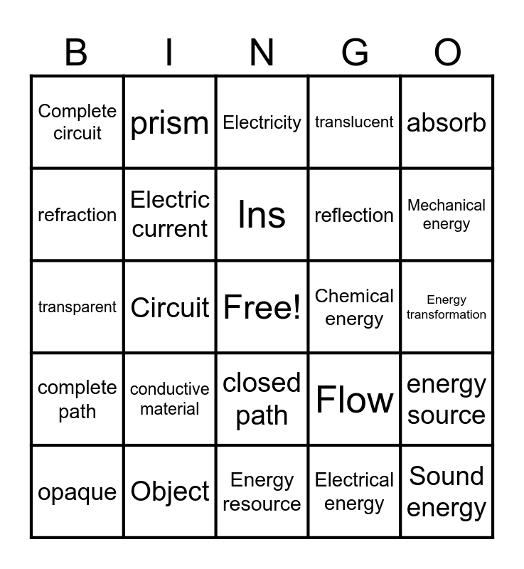 This bingo card has a free space and 31 words: Energy resource, Conductor, Circuit, Motion, Complete circuit, Electricity, Electric current, Flow, Chemical energy, Electrical energy, Energy transformation, Sound energy, Thermal energy, Light energy, Mechanical energy, fuse, energy source, conductive material, complete path, closed path, absorb, medium, opaque, prism, reflection, refraction, translucent, transparent, Object, lns and Absorption.