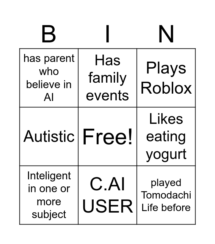This bingo card has a free space and 10 words: C.AI USER, Plays Roblox, has parent who believe in AI, played Tomodachi Life before, Autistic, Inteligent in one or more subject, Has family events, does gym/does physical activity, Likes eating yogurt and Salad/Fruit Salad.
