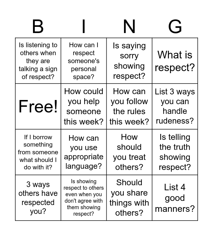 This bingo card has 16 words: Is showing respect to others even when you don't agree with them showing respect?, Is telling the truth showing respect?, Is saying sorry showing respect?, Is listening to others when they are talking a sign of respect?, If I borrow something from someone what should I do with it?, How can I respect someone's personal space?, How should you treat others?, Should you share things with others?, Free!, How could you help someone this week?, 3 ways others have respected you?, What is respect?, How can you use appropriate language?, List 3 ways you can handle rudeness?, How can you follow the rules this week? and List 4 good manners?.