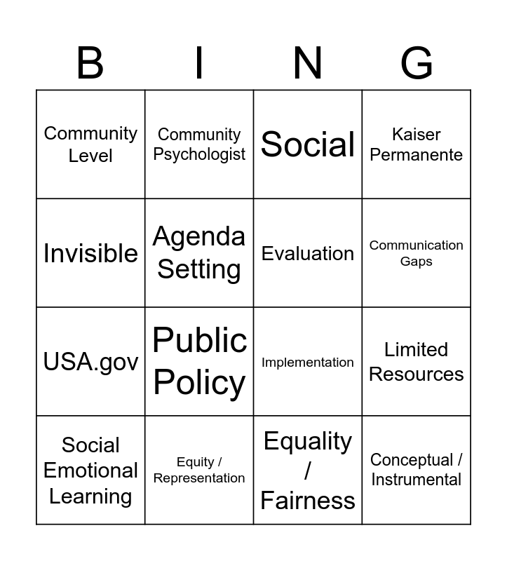 This bingo card has 23 words: Conceptual / Instrumental, Ethics in Public Policy, Communication Gaps, False, Invisible, Community Level, Agenda Setting, Community Psychologist, Social Emotional Learning, Vote, Public Policy, USA.gov, Coalitions, Short-term Thinking, Equity / Representation, School Lunch, Social, Implementation, Evaluation, Limited Resources, Kaiser Permanente, Equality / Fairness and Election.