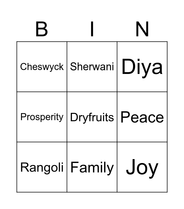 This bingo card has 30 words: Diwali, Fireworks, Sweets, Lakshmi, Cheswyck, Diya, Rangoli, Lights, Party, Dance, Song, Flowers, Ganesh, Decoration, Friends, Gifts, Feast, Sita, Lantern, Dryfruits, Ram, Jewellery, Sherwani, Joy, Peace, Prosperity, Gold, Dhanteras, Family and Prayers.