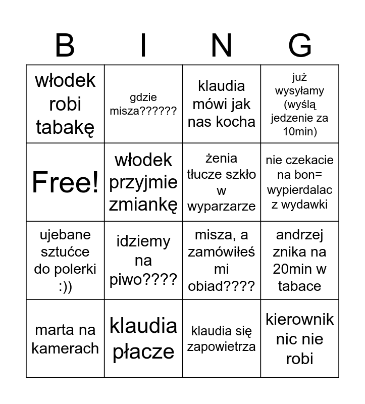 This bingo card has 16 words: klaudia płacze, andrzej znika na 20min w tabace, klaudia mówi jak nas kocha, włodek robi tabakę, ujebane sztućce do polerki :)), gdzie misza??????, misza, a zamówiłeś mi obiad????, klaudia się zapowietrza, Free!, włodek przyjmie zmiankę, marta na kamerach, już wysyłamy (wyślą jedzenie za 10min), idziemy na piwo????, nie czekacie na bon= wypierdalac z wydawki, żenia tłucze szkło w wyparzarze and kierownik nic nie robi.