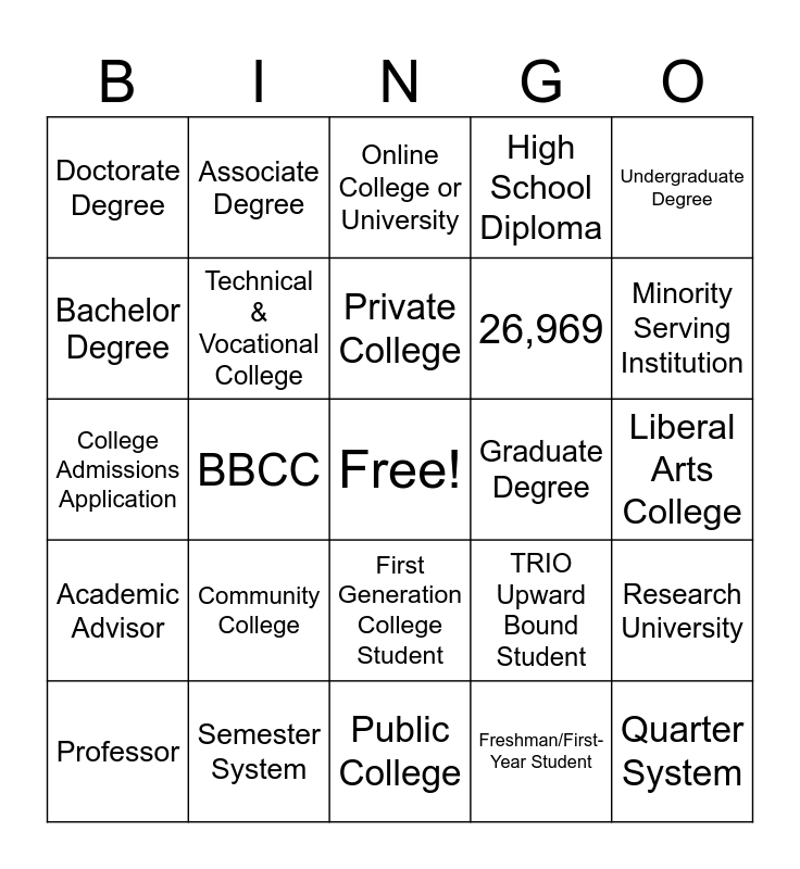 This bingo card has a free space and 25 words: Community College, Public College, Private College, Professor, Undergraduate Degree, Doctorate Degree, Bachelor Degree, Associate Degree, Graduate Degree, First Generation College Student, 26,969, College Admissions Application, TRIO Upward Bound Student, Research University, Technical & Vocational College, Women's or Men's College, Liberal Arts College, Online College or University, Minority Serving Institution, BBCC, Quarter System, Semester System, Academic Advisor, High School Diploma and Freshman/First-Year Student.